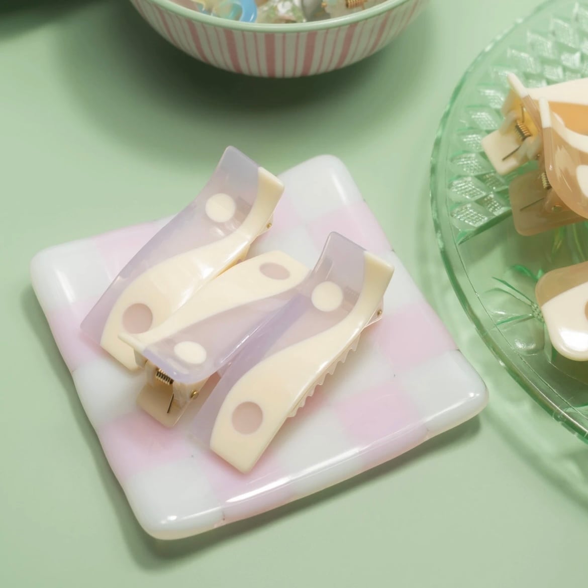 それぞれのヘアアクセサリーは醋酸セルロースで作られており