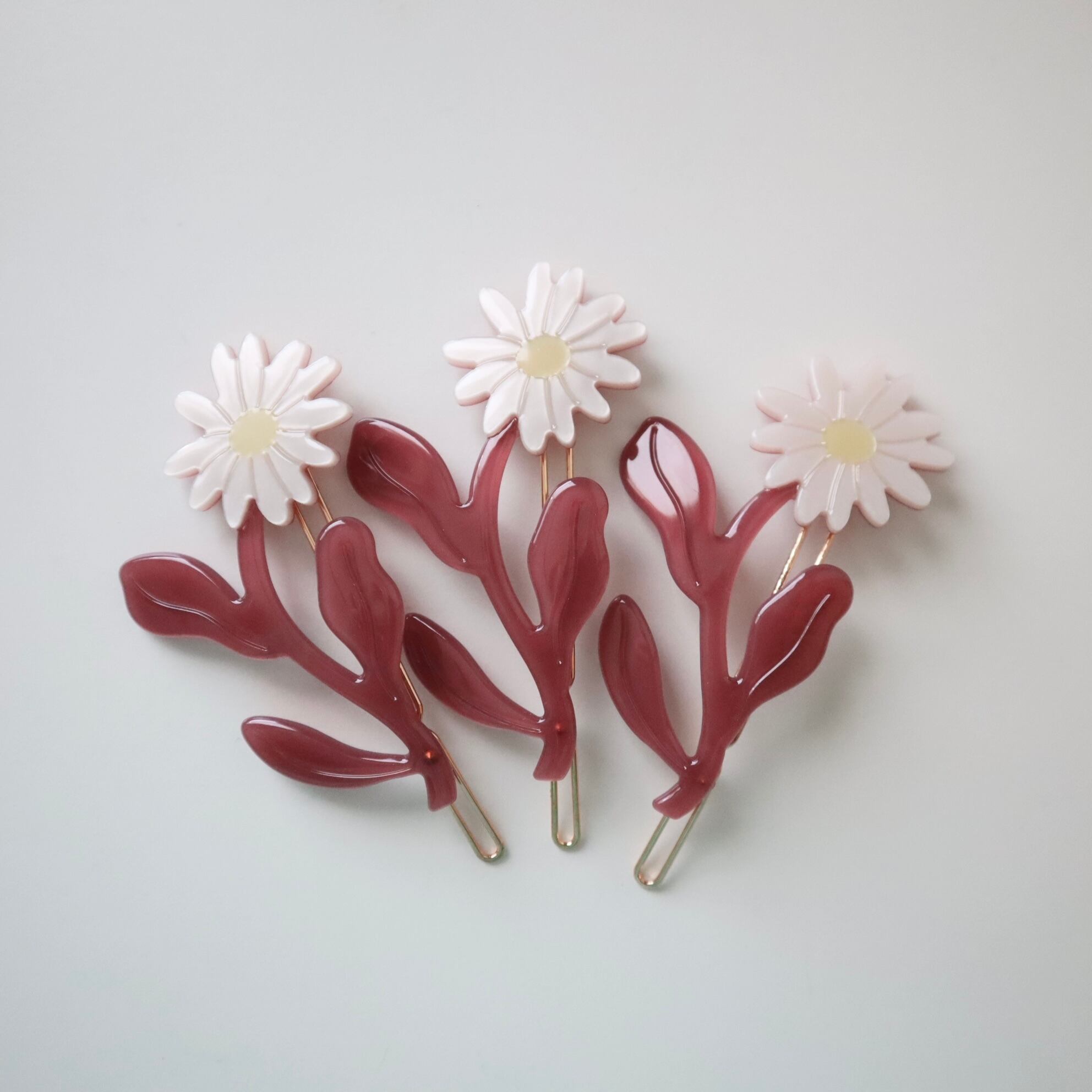 大きめのお花に柔らかい曲線の茎や葉が美しいマーガレットクリップ。